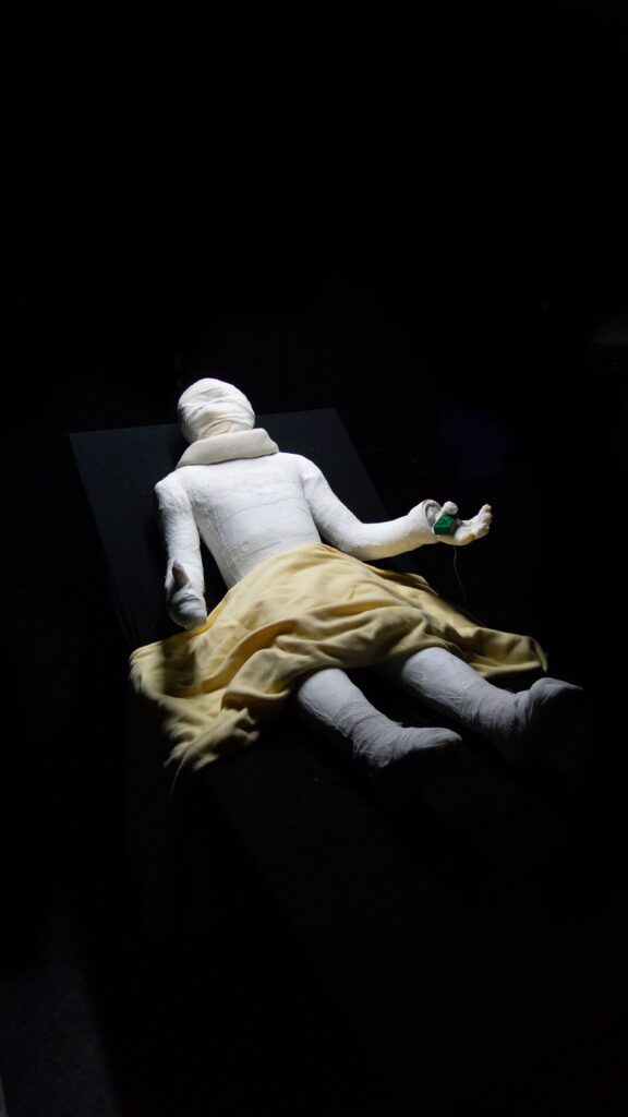 Ne me faites pas entendre ce que je n’ai pas dit est un seul en scène intimiste et absurde, mélangeant marionnette clownesque, expérience sonore et magie nouvelle. Les spectateurs viennent rendre visite à une marionnette incarnant un homme au corps fracturé, suite à un accident. Casque aux oreilles et à quelques centimètres, ils sont face à un personnage alité, à moitié emplâtré, agonisant (avec humour) sur son lit d’hôpital. Les effets secondaires de la morphine le poussent à se livrer un peu trop, jusqu’à révéler ses fantasmes et ses souvenirs honteux, et il finit par embarquer les spectateurs dans ses hallucinations. Le spectacle se transforme alors en une sorte de séance absurde de psychanalyse, remplie d’illusions, dans laquelle on devient le confident d’un homme dont l’accident apparaît plutôt comme un véritable acte manqué.
